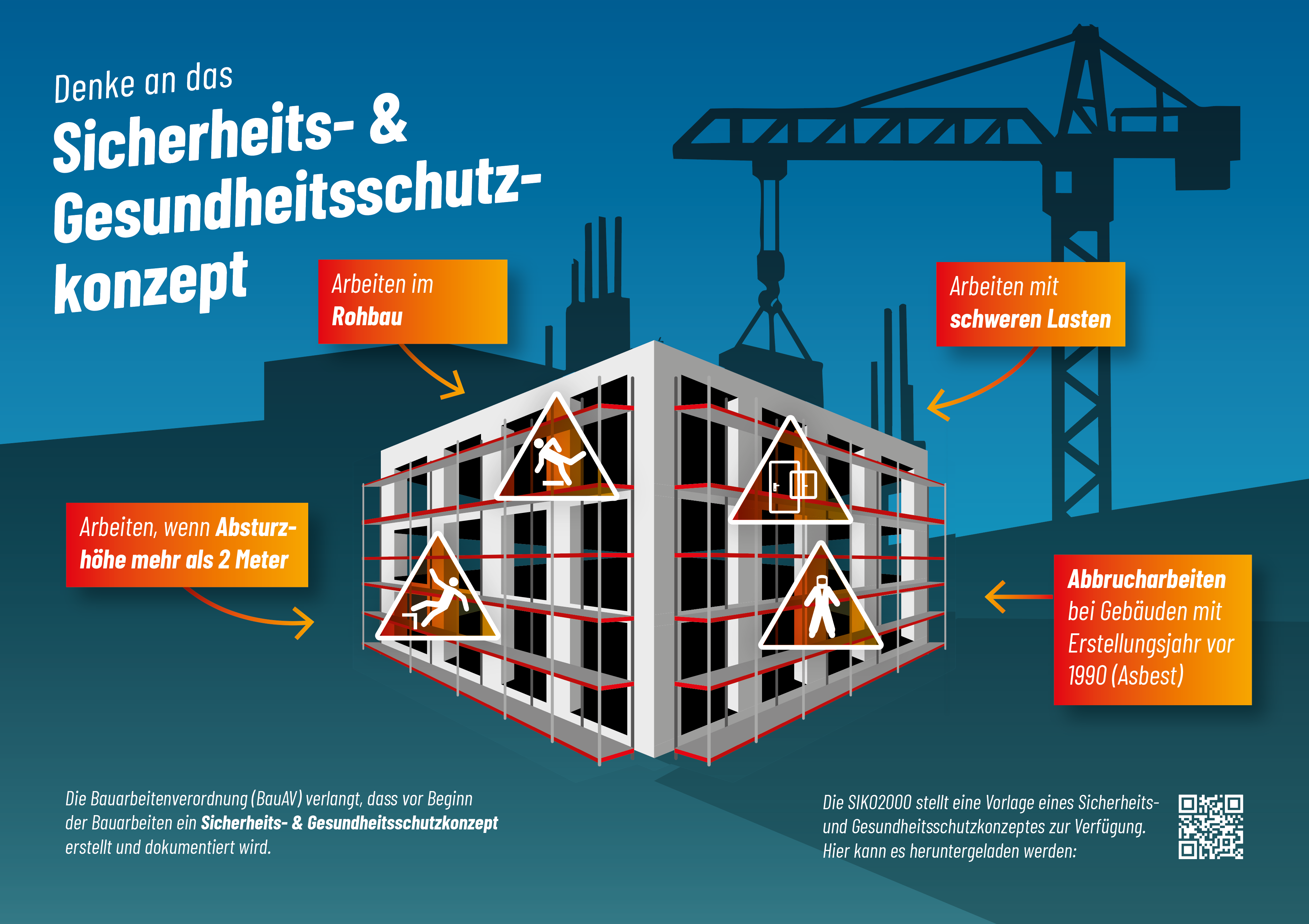 Per 1. Januar 2022 ist die neue Bauarbeitenverordnung (BauAV) in Kraft getreten. Neben der Harmonisierung aller Absturzhöhen und den Anpassungen der Massnahmen an den Stand der Technik, hat der Arbeitgeber Bauarbeiten so zu planen, dass das Risiko von Berufsunfällen und Berufskrankheiten oder Gesundheitsbeeinträchtigungen möglichst klein ist. Neu ist dies nach der Bauarbeitenverordnung 2022 mit einem Sicherheits- und Gesundheitsschutzkonzept schriftlich zu dokumentieren (Art. 4). Im Grundsatz ist gemäss BauAV für alle Bauarbeiten ein angemessenes Konzept erforderlich. Die SIKO empfiehlt insbesondere bei nachfolgenden Arbeiten die Erstellung eines Sicherheits- und Gesundheitsschutzkonzeptes: