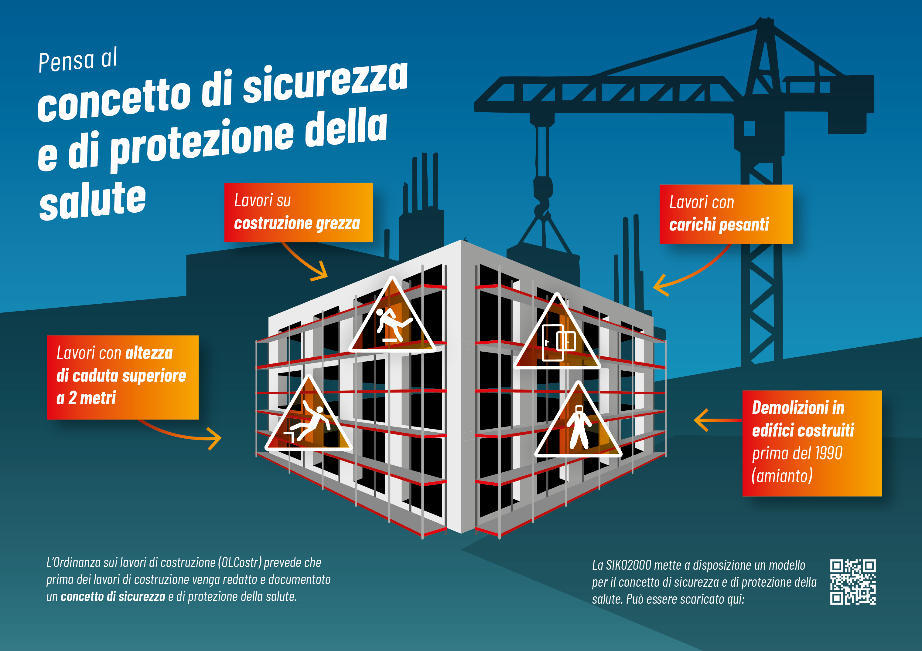 Dal 1° gennaio 2022 è entrata in vigore la nuova Ordinanza sui lavori di costruzione (OLCostr). Oltre all'armonizzazione di tutte le altezze di caduta e l'adattamento delle misure allo stato della tecnica, il datore di lavoro deve pianificare i lavori di costruzione in modo tale che il rischio di incidenti e malattie professionali o danni alla salute sia il più basso possibile. Secondo l'ordinanza sui lavori di costruzione 2022 (art. 4), questo deve ora essere documentato per iscritto con un concetto di sicurezza e di protezione della salute (CoSiPro). In linea di principio, secondo la OLCostr un CoSiPro è richiesto per tutti i lavori di costruzione. La SIKO raccomanda la preparazione di un concetto in particolare per i seguenti lavori: